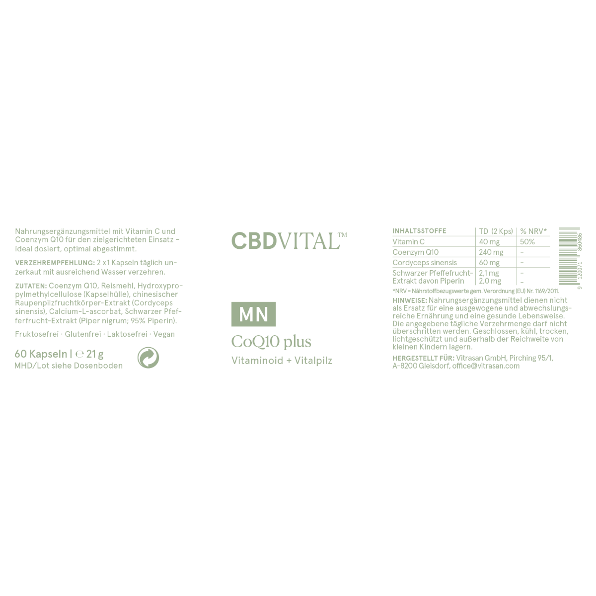 CBD Vital Coenzym Q10 plus sind Kapseln mit Vitamin C, Cordyceps und Piperin und liefern 240 mg Coenzym Q10 pro Tagesdosis. Laut Hersteller ist das Produkt „für Energie und Wohlbefinden“ konzipiert und eignet sich auch als Unterstützung im Sport („Ideale Unterstützung im Sport“). Eigenschaften: 60 Kapseln, glutenfrei, laktosefrei und fruktosefrei.