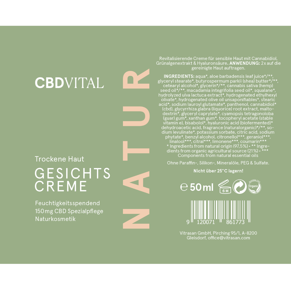 CBD Vital Gesichtscreme Trockene Haut: Revitalisierende Pflege mit 150 mg CBD, biofermentierter Hyaluronsäure, Aloe Vera, Grünalgenextrakt (QT40), Hanfsamenöl, Süßholzextrakt und Dexpanthenol. Für sensible, trockene Haut – reduziert Spannungen, spendet intensive Feuchtigkeit, fördert Elastizität.