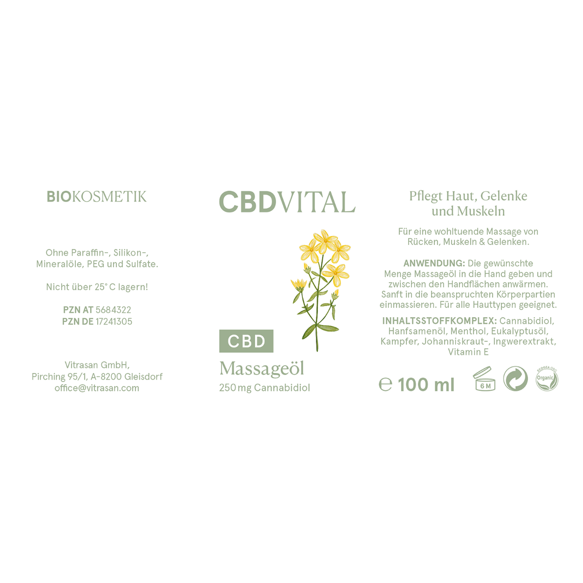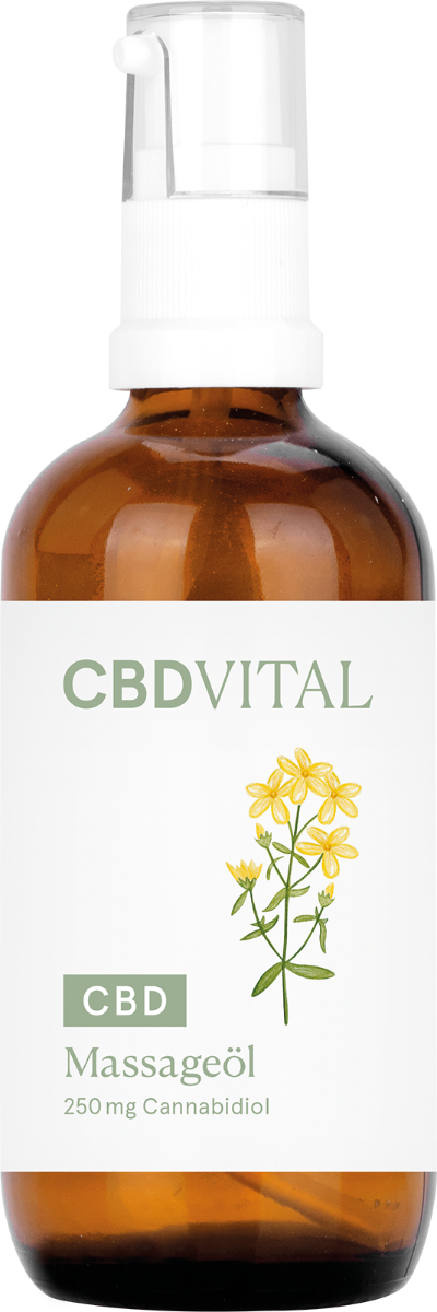 CBD Vital Massageöl mit 250 mg reinem Cannabidiol (CBD) ist eine pflegende Öl-Mischung aus Hanfsamen-, Mandel-, Jojoba- und Sonnenblumenöl.