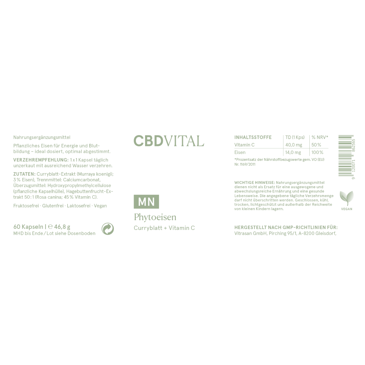 CBD VITAL beschreibt das Produkt als „rein pflanzliches Eisen“ aus Curryblatt, kombiniert mit natürlichem Vitamin C aus Hagebutte, um die Eisenaufnahme zu verstärken. Bei green.one CBD Oel Shop findest du passende Produkte für einen bewussten Lifestyle – bequem online bestellen und ohne Umwege in deinen Alltag integrieren.