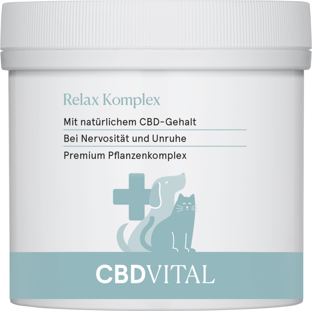 CBD Vital Relax Komplex ist ein spezielles Ergänzungsfuttermittel für Hunde und Katzen mit Baldrian, Melisse, Hopfen, Bierhefe und Johanniskraut. Die Premium-Rezeptur unterstützt mehr innere Balance und Ausgeglichenheit – ideal als pflanzliche Unterstützung bei Unruhe, gesteigerter Aktivität oder Überdrehtheit im Alltag.