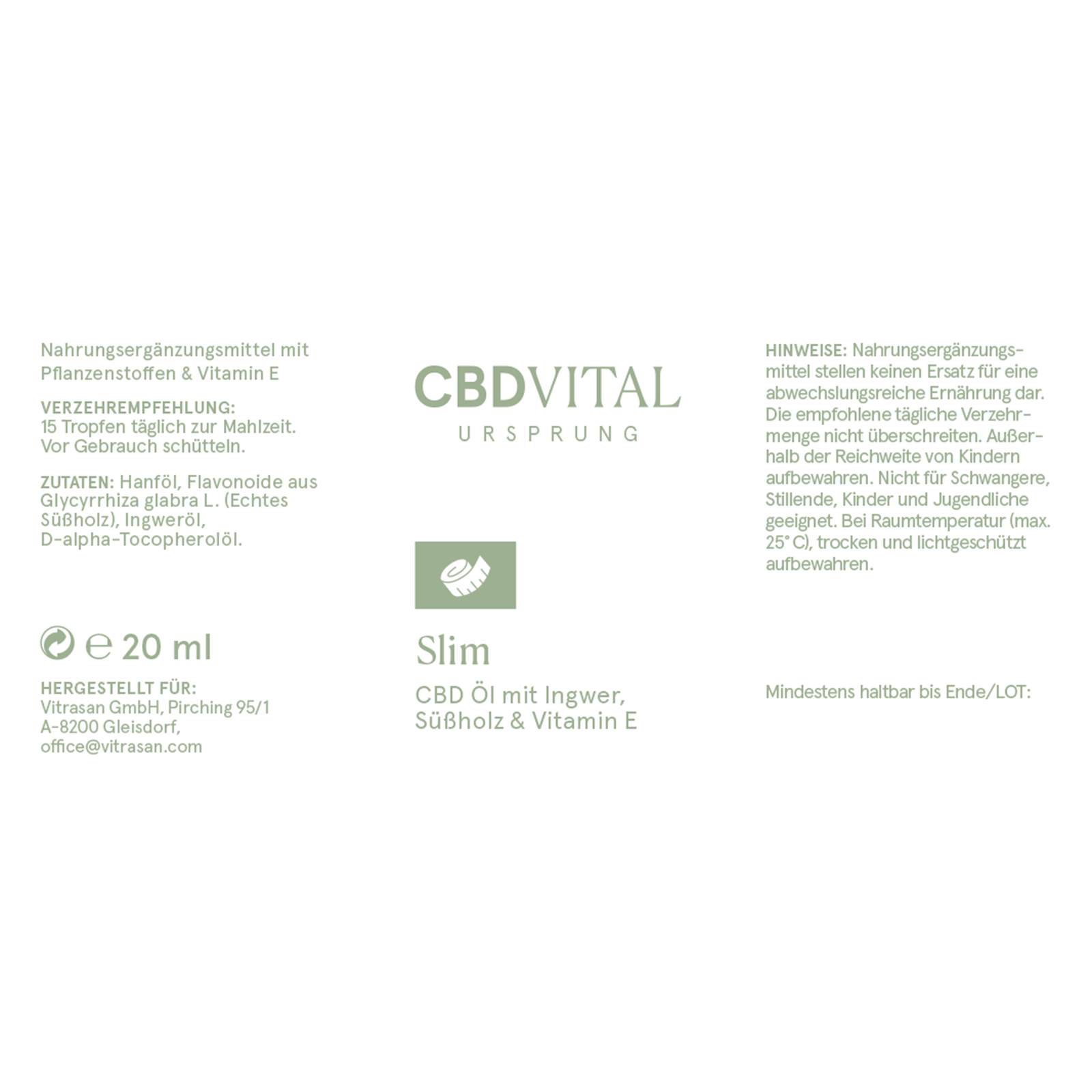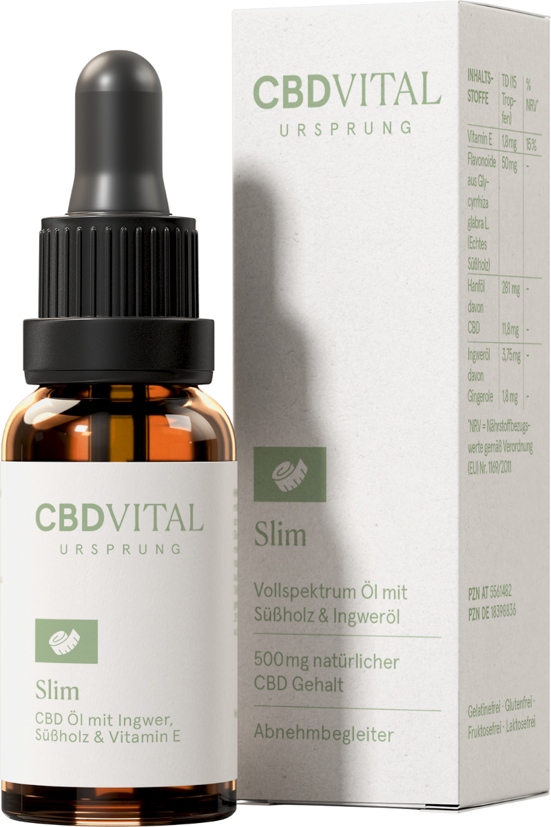 CBD Vital Ursprung SLIM Öl ist ein Bio-Vollspektrum-CBD-Öl mit 500 mg natürlichem CBD in 20 ml und einer Spezialformel mit CBD, Süßholzwurzel & Ingwer. Laut Hersteller ist es für einen kontrollierten Appetit, einen aktiven Stoffwechsel und als Unterstützung beim Abnehmen konzipiert. Es wird als Öl mit Pipette angeboten, ist glutenfrei, laktosefrei und fruktosefrei und basiert auf Bio-Hanföl als Träger.