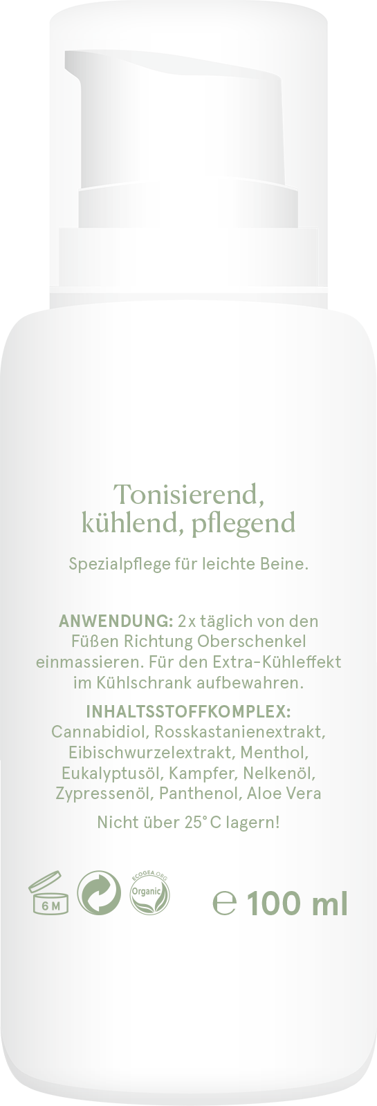 CBD Vital Venengel FORTE 2-3 Mal täglich von den Füßen aufwärts in Richtung Oberschenkel sanft einmassieren. Für den Extra-Kühleffekt das Gel im Kühlschrank aufbewahren. Für eine ganzheitliche Lösung und leichte Beine von Innen mit unserem OPC forte (Traubenkernextrakt) und Vitamin C gepuffert kombinierbar.