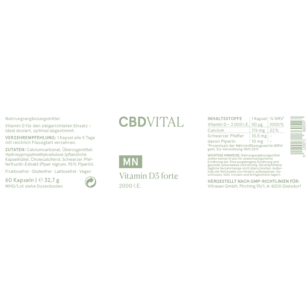 Zutaten: Calciumcarbonat, Überzugsmittel: Hydroxypropylmethylcellulose (vegetarische Kapselhülle), Cholecalciferol, Schwarzer-Pfeffer-Fruchtextrakt (Piper nigrum; 95 % Piperin).