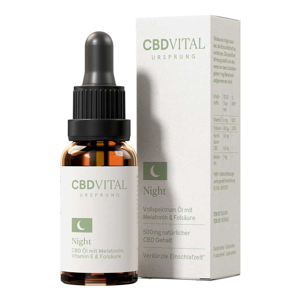 CBD Ursprung Night Drops by CBD VITAL combine pressed hemp oil with natural CBD (no extraction), melatonin and folic acid to support sleep onset and maintenance. Each 20 ml bottle contains approximately 500 mg CBD (and CBG), ~750 drops; mild flavor, light golden color. Free from lactose, gluten and fructose; THC below detectable limits (GC‑MS). Recommended use: about 10 drops before bedtime. Not suitable for pregnant or breastfeeding women, children or adolescents. Manufacturer: CBDVital. Ready to ship; delivery 1–3 days.