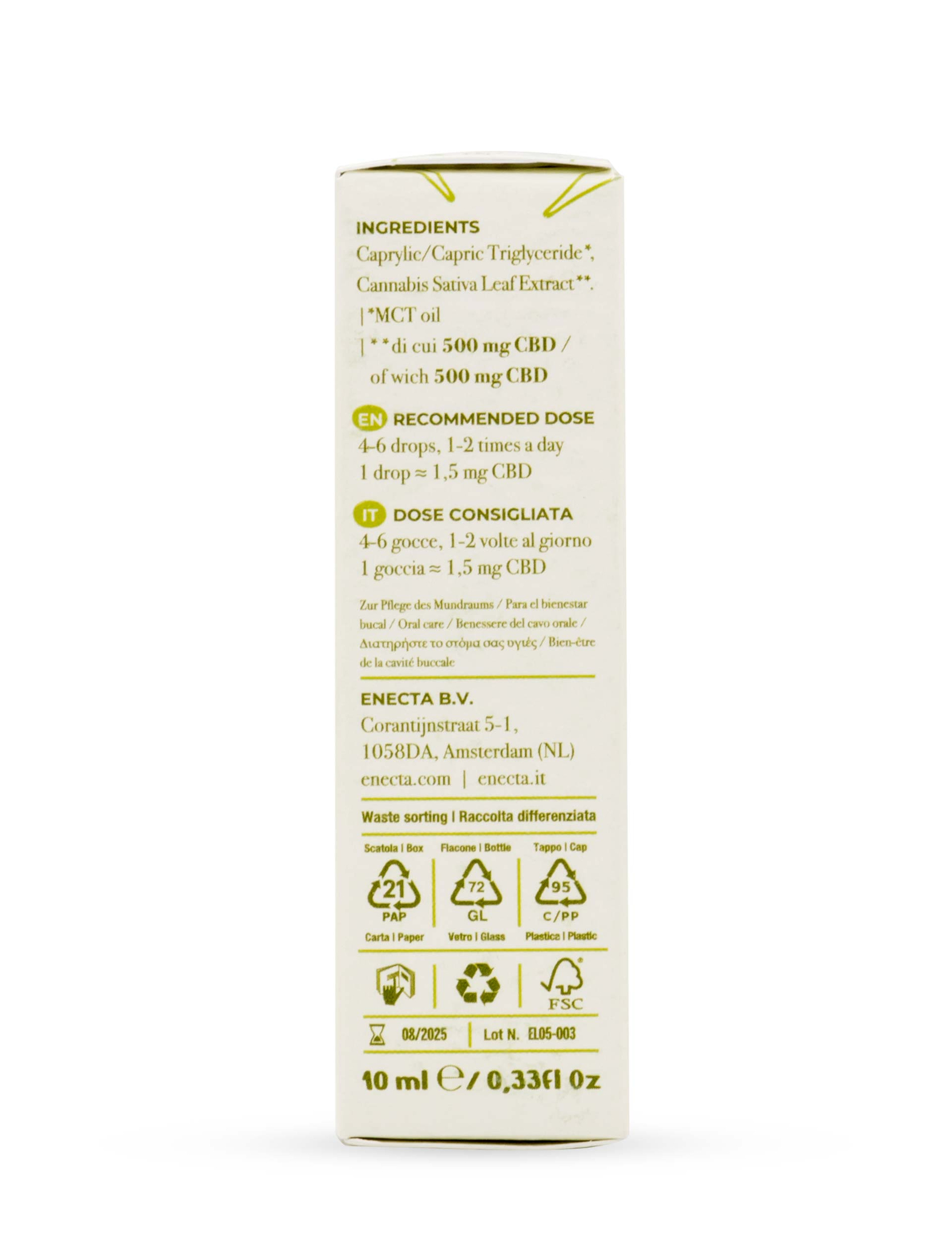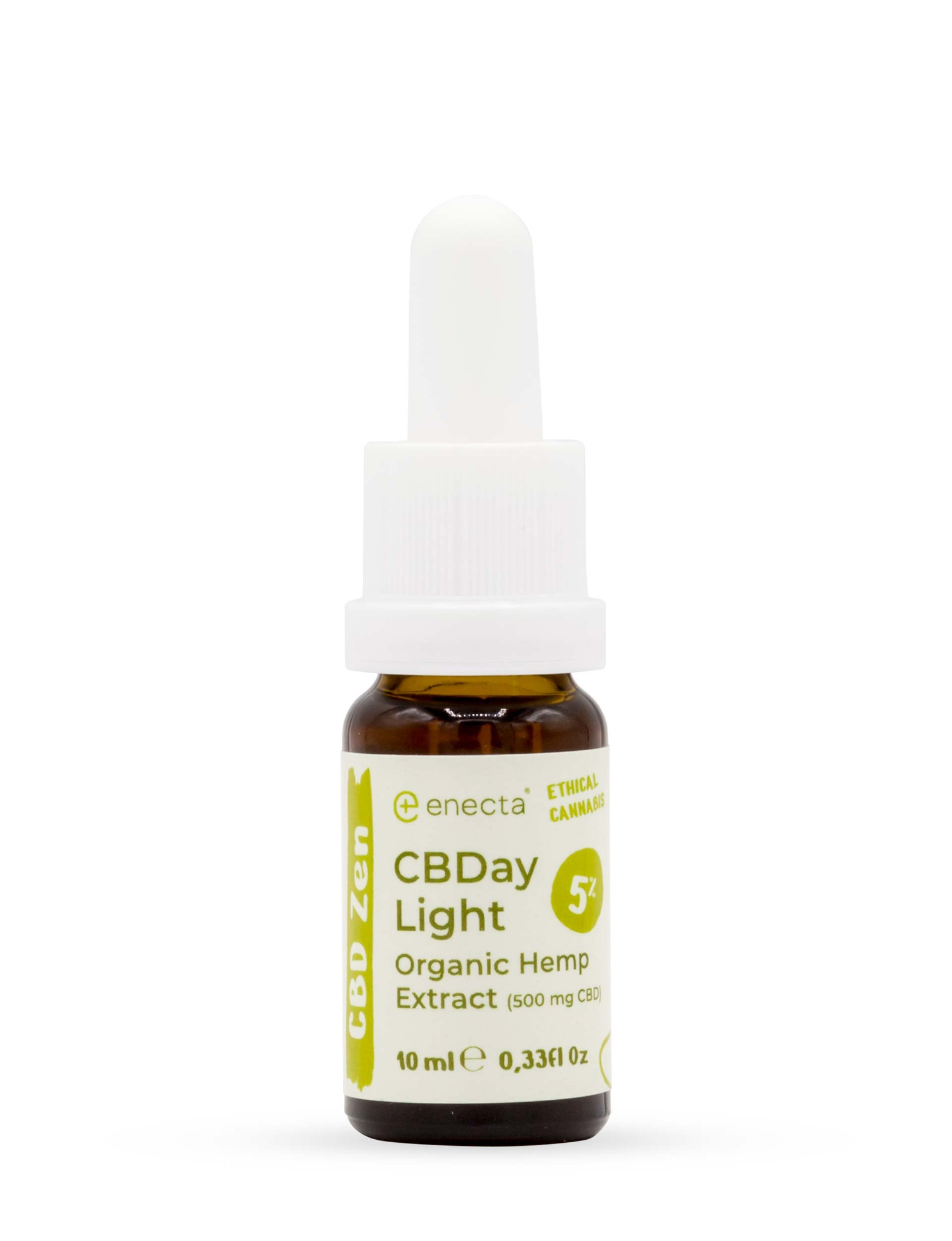 CBDay Light 5% — a 10 ml (500 mg CBD) oil from Enecta’s Enectaliana® genetics, developed in Europe for CBD extraction with a cannabinoid and terpene profile tailored for anxiolytic effects. Ingredients: MCT (caprylic/capric triglycerides) and cannabidiol. 100% vegan; free from allergens, additives, pesticides and heavy metals. Recommended use: sublingual — place drops under the tongue and hold 1–2 minutes. Supplied in a UV‑protective glass bottle with pipette. Flavor: hemp. Ready to ship; delivery 1–3 days.