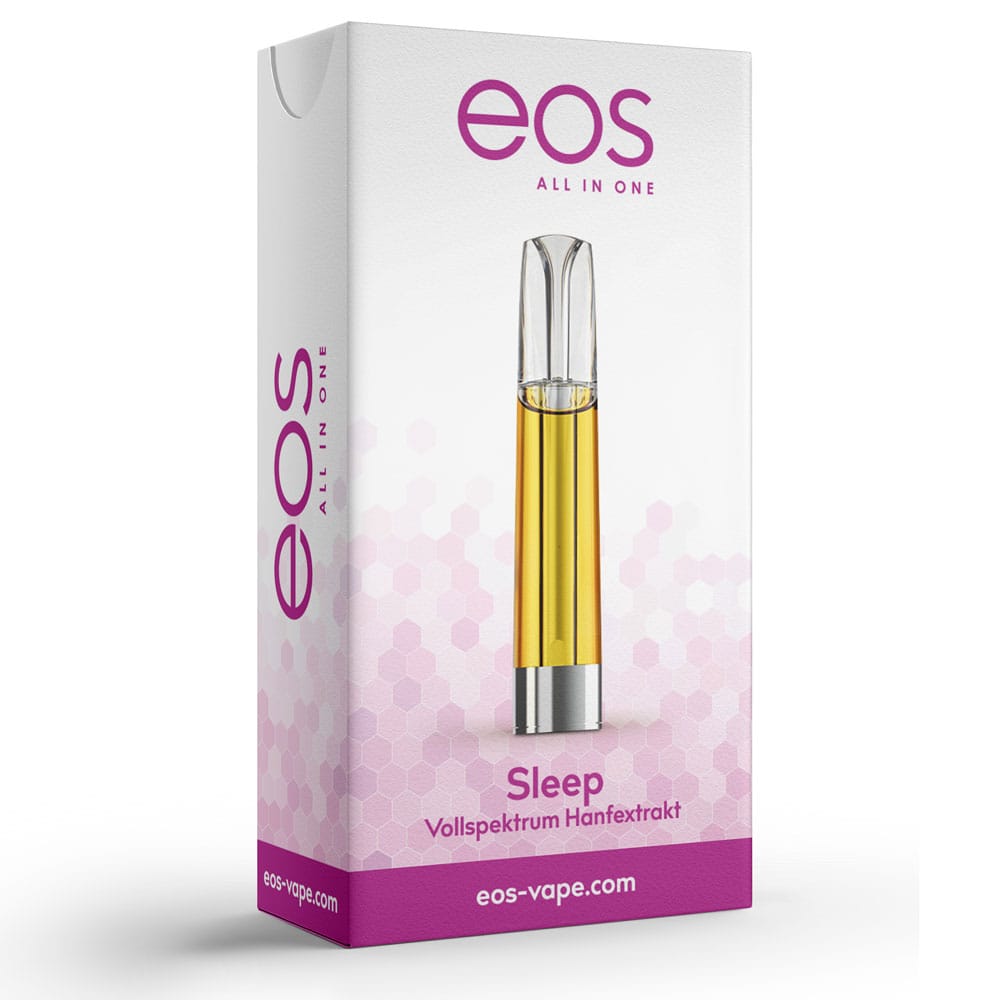 The eos Cartridge Sleep is a premium, natural 0.5 ml CCell vape cartridge for wholesalers and retailers. Formulated from 100% Cannabis sativa extract, it leverages the entourage effect—containing ~74% cannabinoids (≈52% CBD) and natural terpenes (β‑caryophyllene, linalool, α‑bisabolol). THC <0.2%—EU‑compliant. PG/VG‑free, GMO‑free, sustainably grown. Compatible with eos Vape Pen and any 510‑thread battery. Recommended: start low, max 10–15 puffs/day. Not for pregnant or breastfeeding persons or under‑18s; terpenes may trigger sensitivities. Ready to ship (1–3 days). Includes 0.5 ml cartridge and info leaflet.